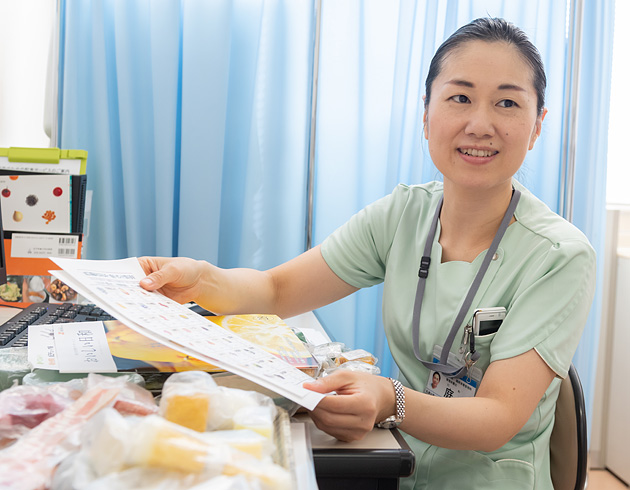 入院時、管理栄養士が患者様を訪問し、食事内容のご説明をしています。また、医師の指示のもと外来・入院・退院時にも栄養指導を実施しています。 現在、全ての栄養指導を月に約60件実施しています。